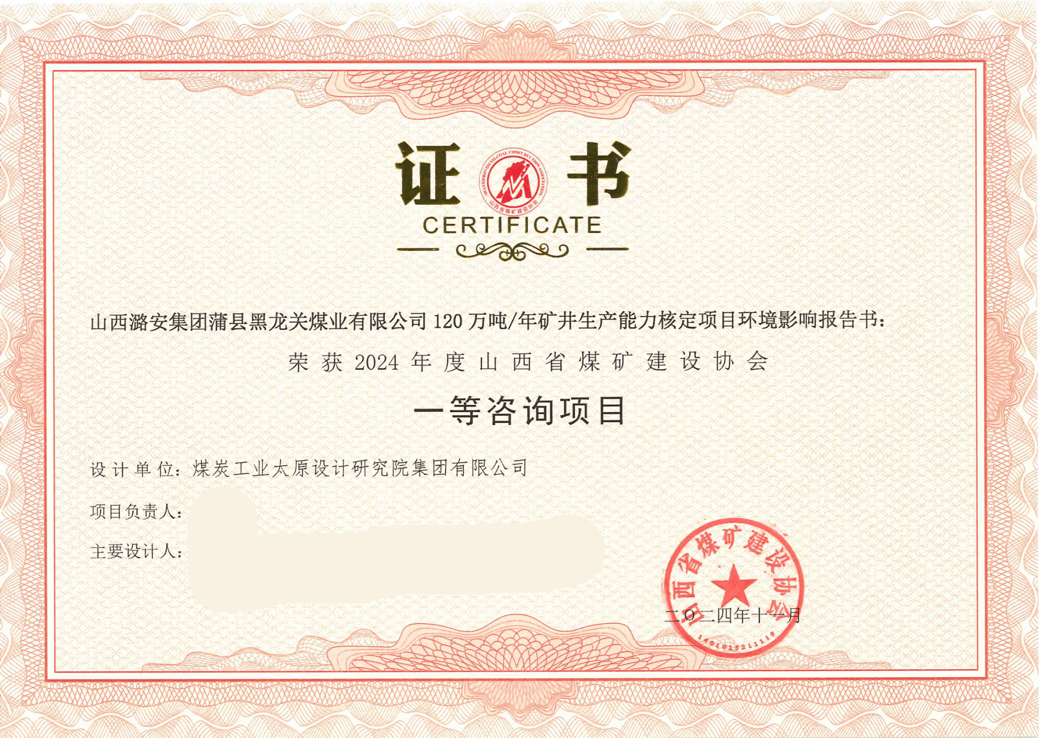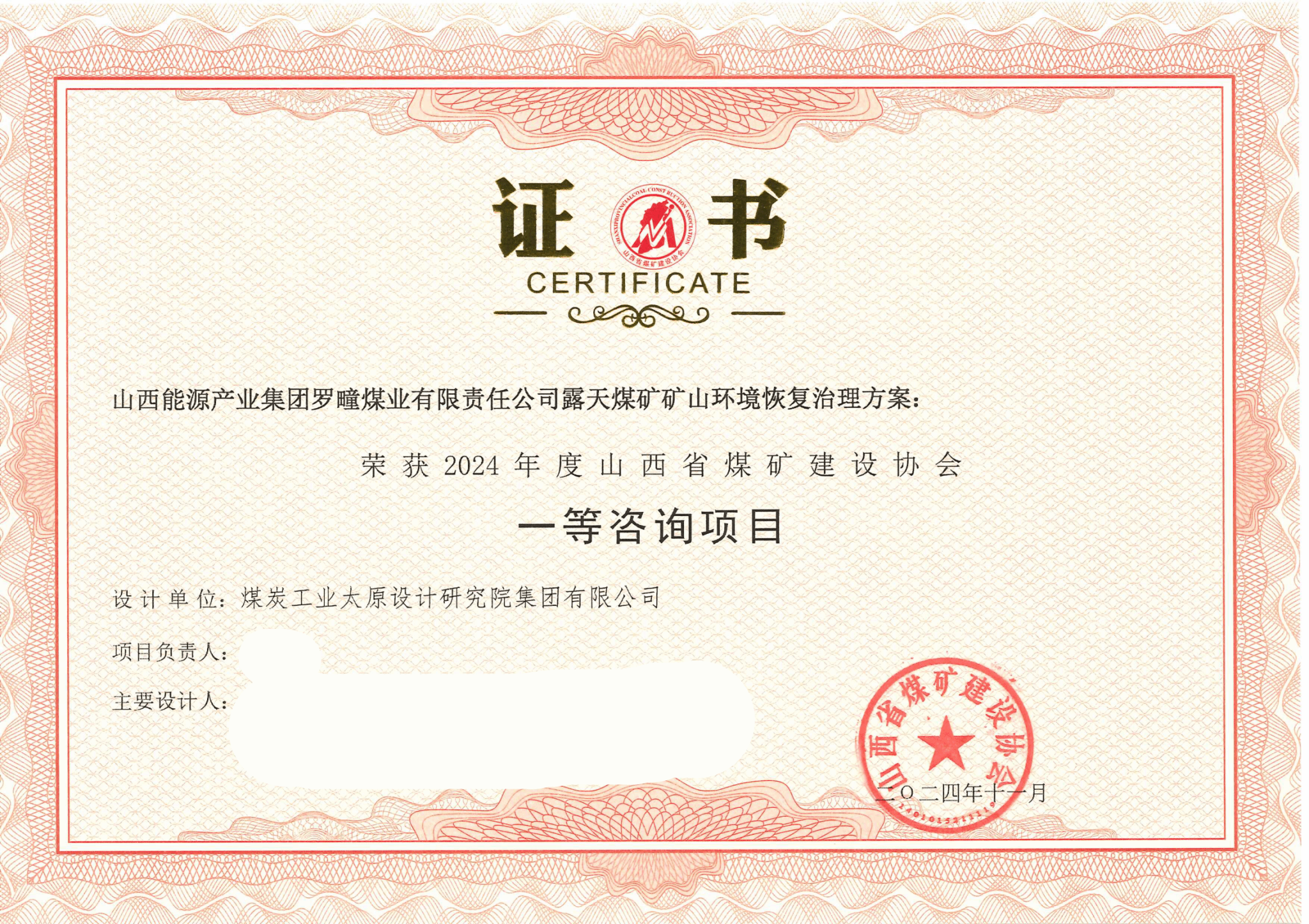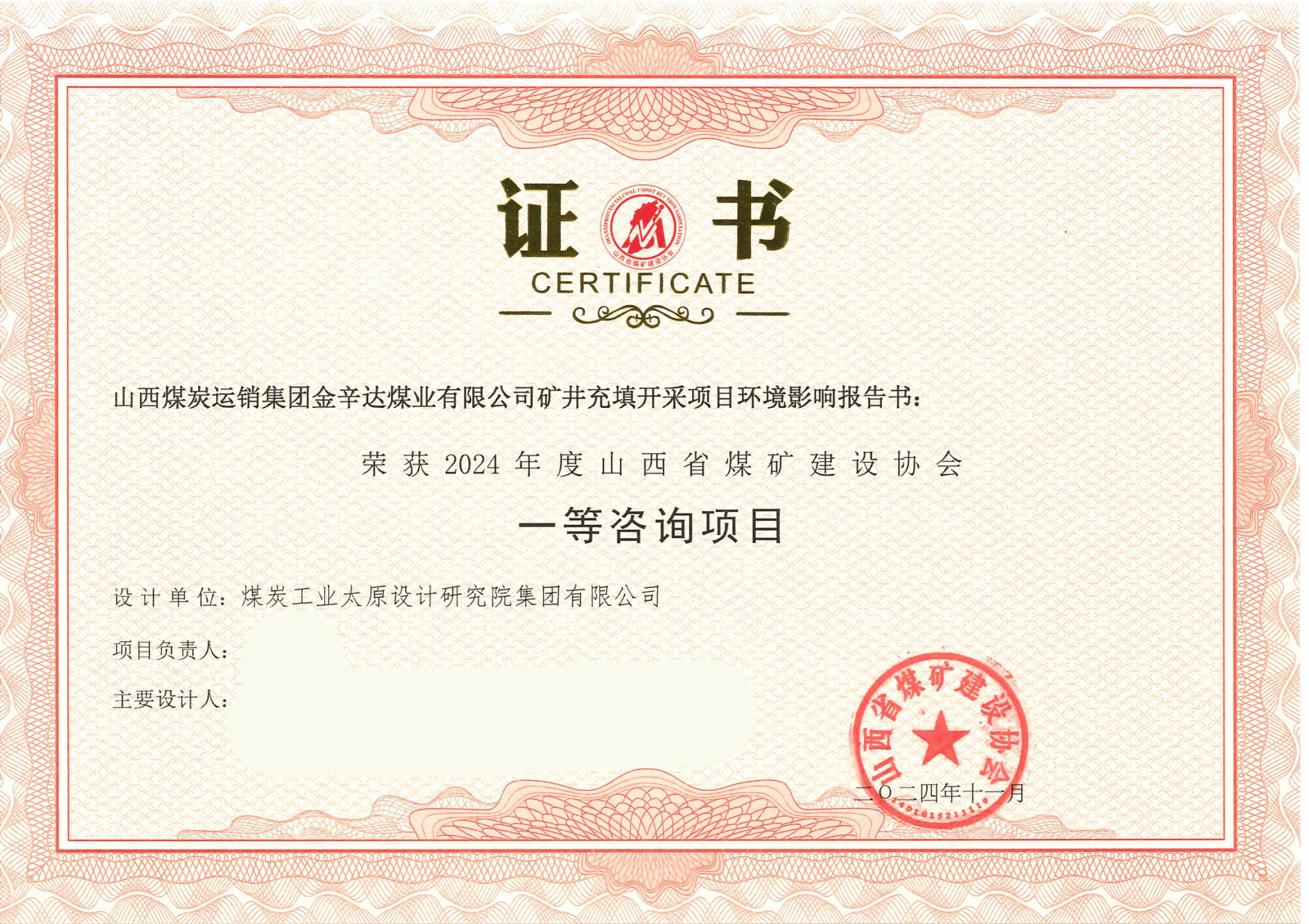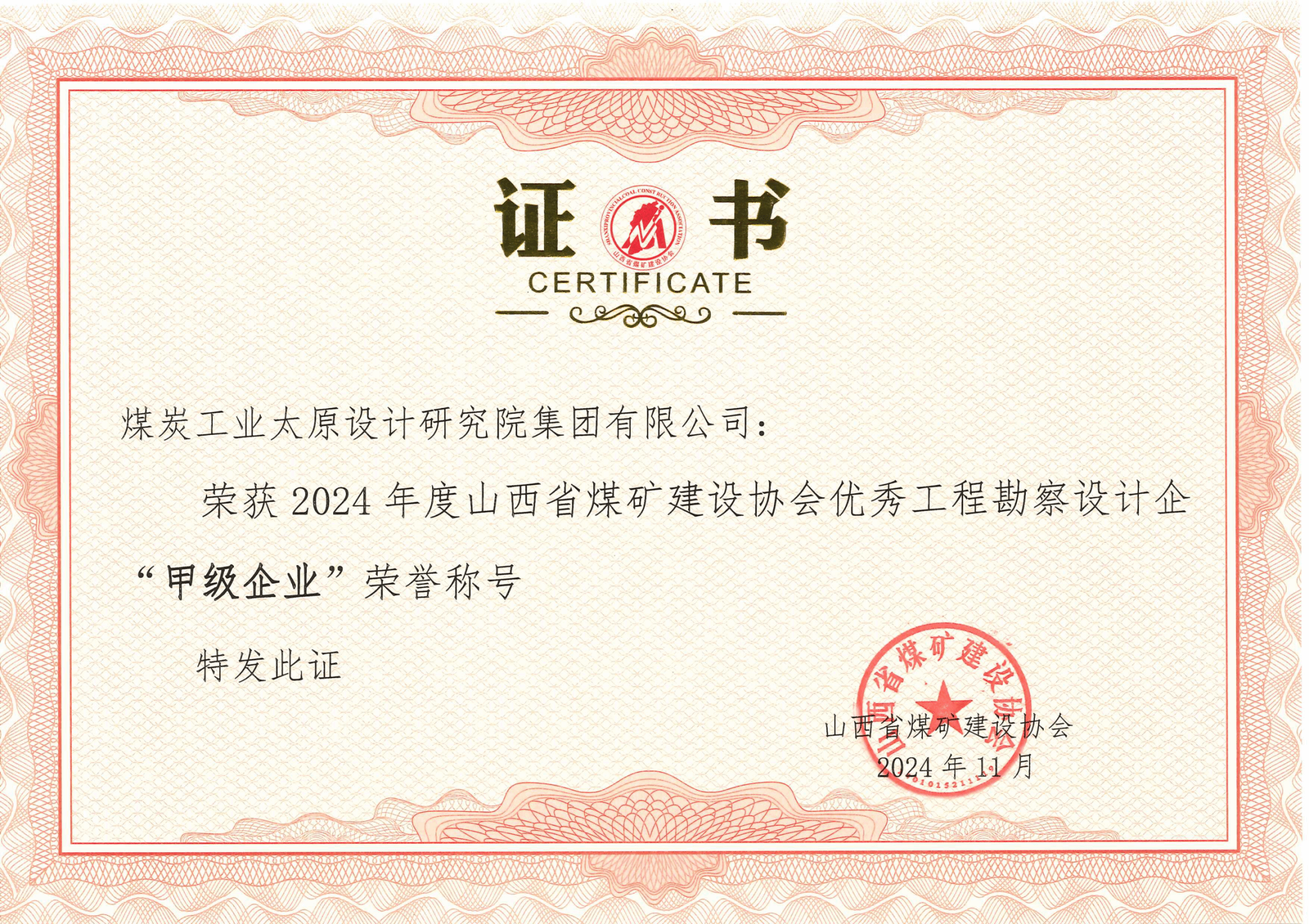 山西省煤矿建设协会优秀工程勘察设计“甲级企业”